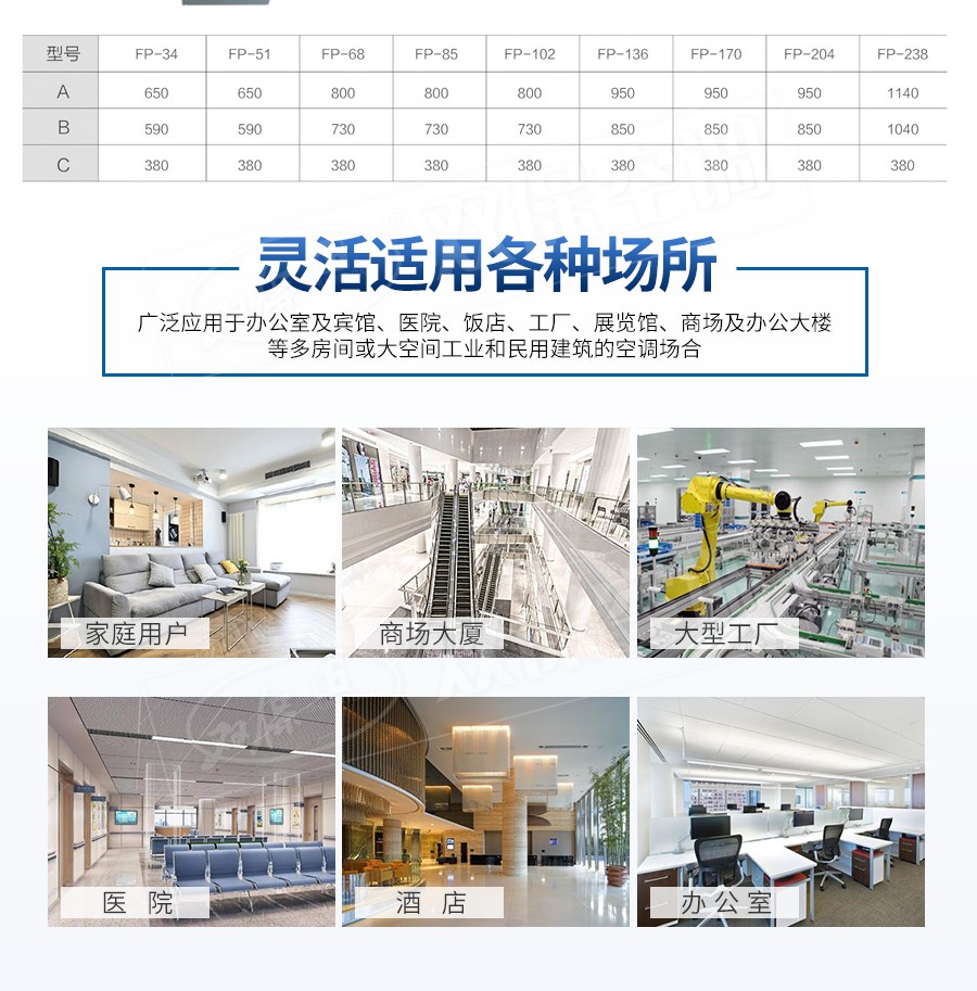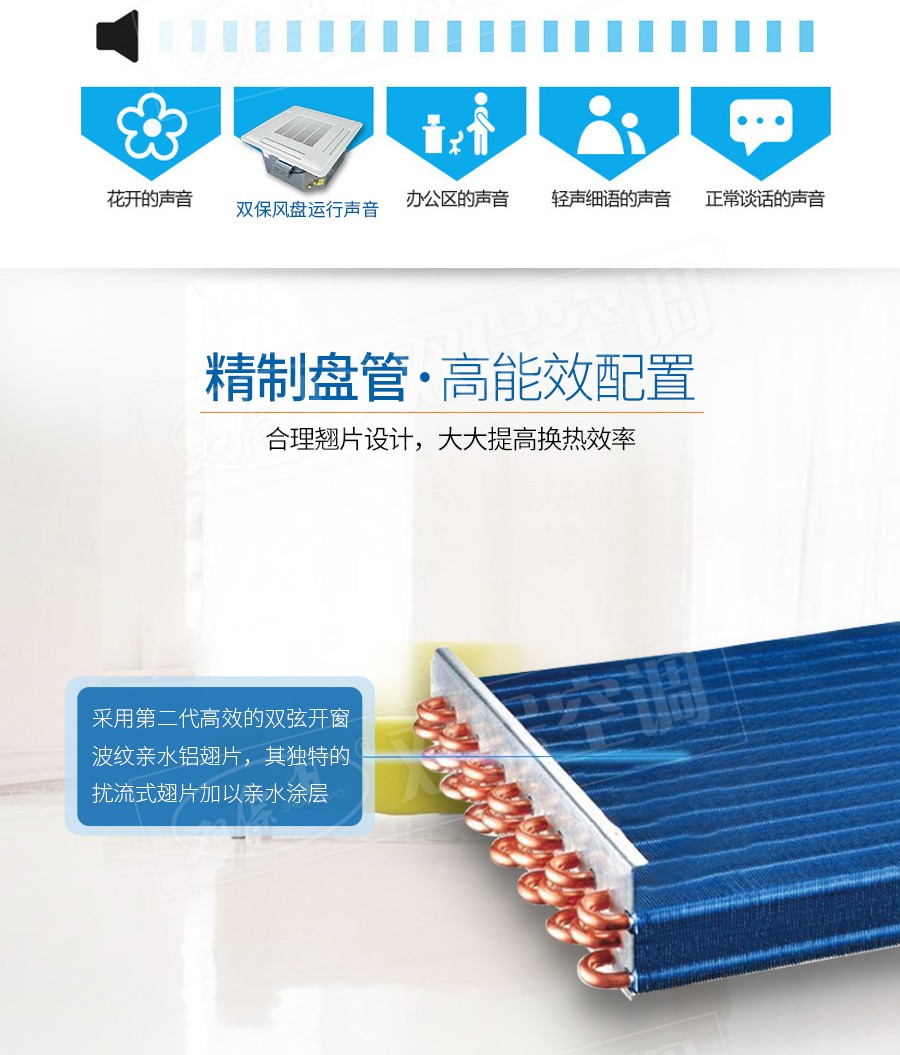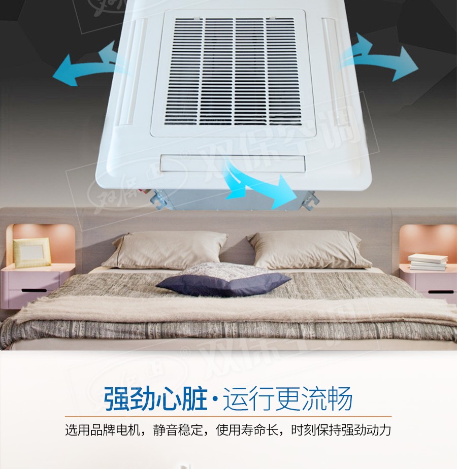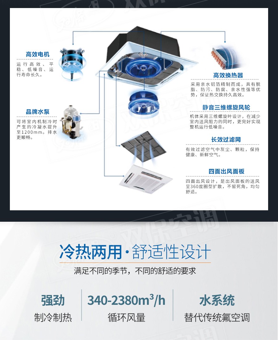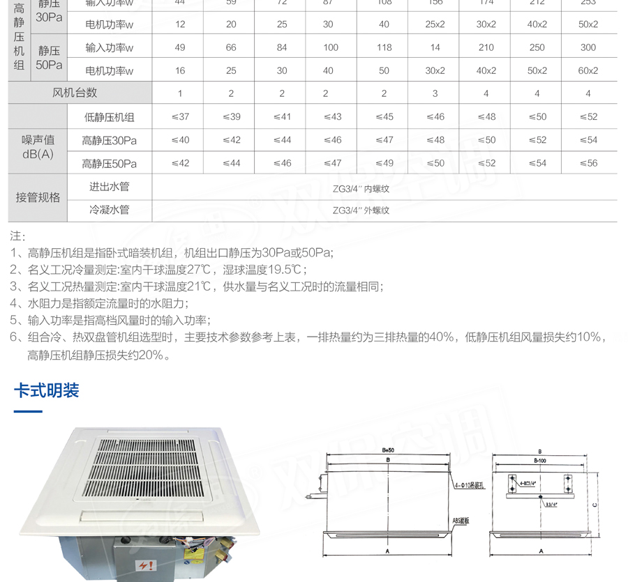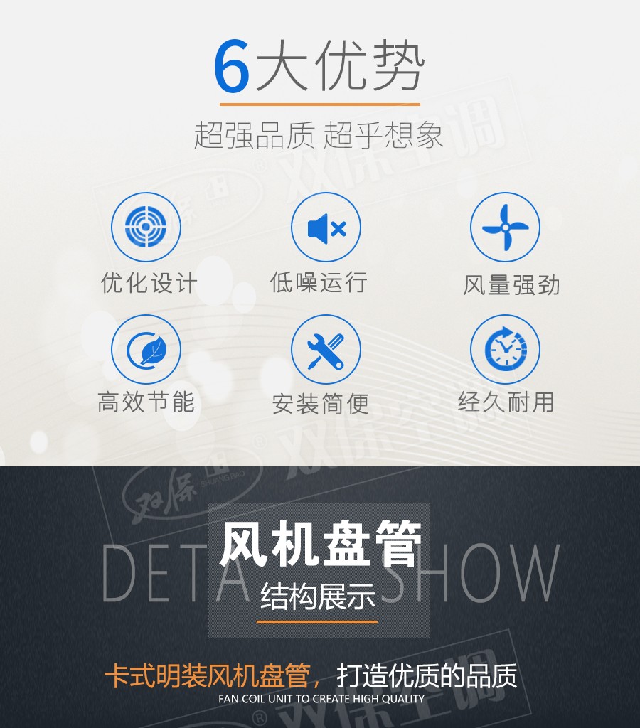 江蘇雙保空調有限公司—卡式明裝風機盤管是中央空調理想的末端產品,其工作原理是機組內不斷的再循環所在房間或室外的空氣,使空氣通過冷水(熱水)盤管后被冷卻(加熱),以保持房間溫度的恒定。外形美觀,與新風機組配套后廣泛應用于賓館、醫院、辦公用房、高級會議廳、展覽廳等低噪聲場所。