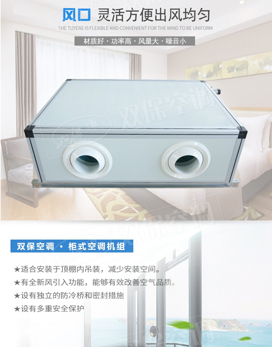 江蘇雙保空調有限公司—YS遠程射流空調機組在具備冷卻、加熱、干燥、加濕功能的同時,可實現無風管遠距離直接送風,具有節省空間、降低層高、一次性投資大幅度減小、運行費用低等特點,同時機組送風角度可在60范圍內自由調節,確保冷熱風送到指定位置,創造出舒適的空調環境。